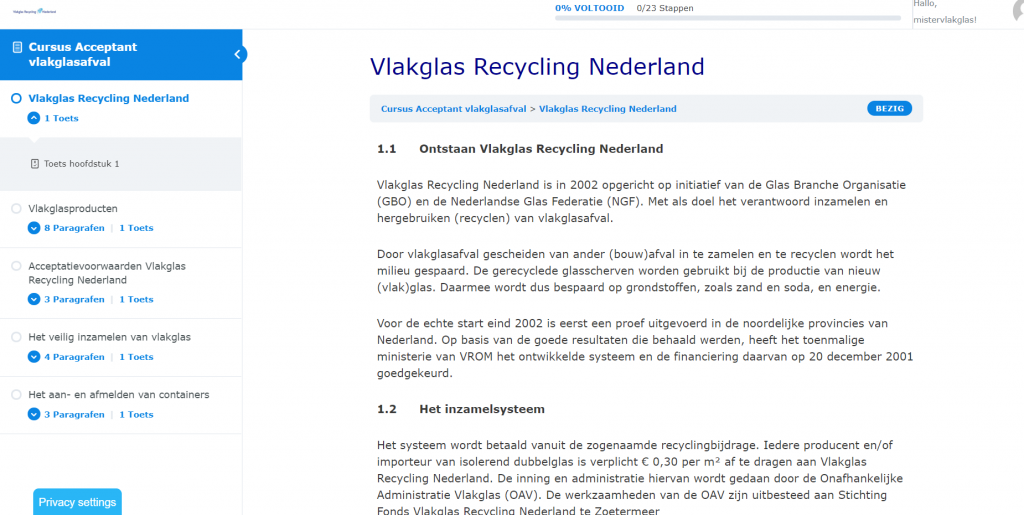 Klik op de blauwe tekst “Klik hier om te starten met de cursus Acceptant Vlakglasafval”